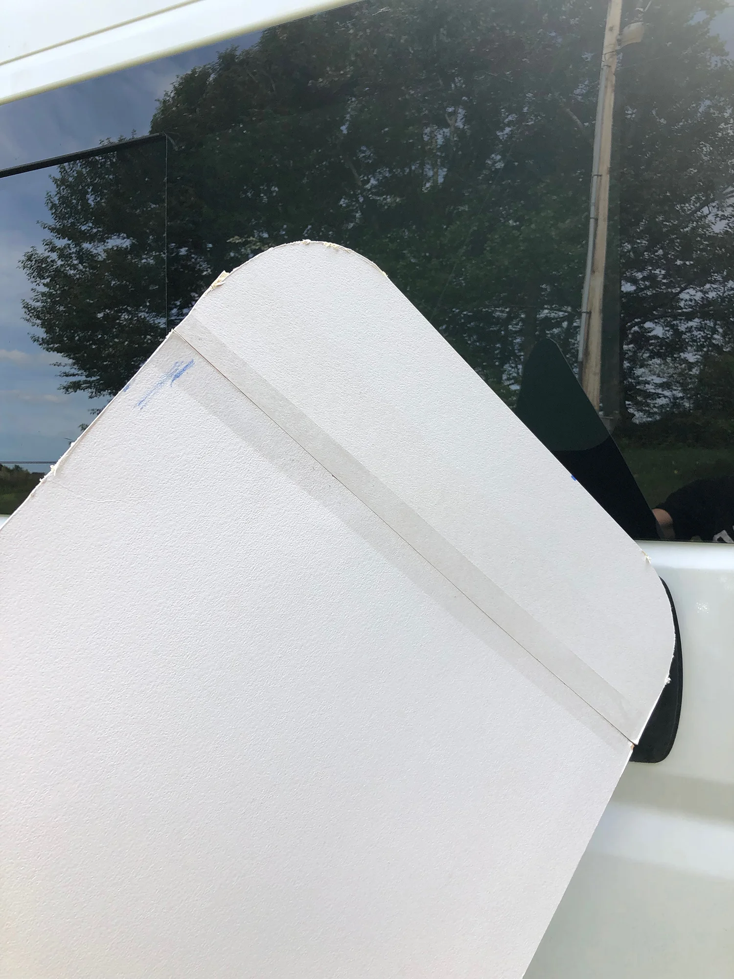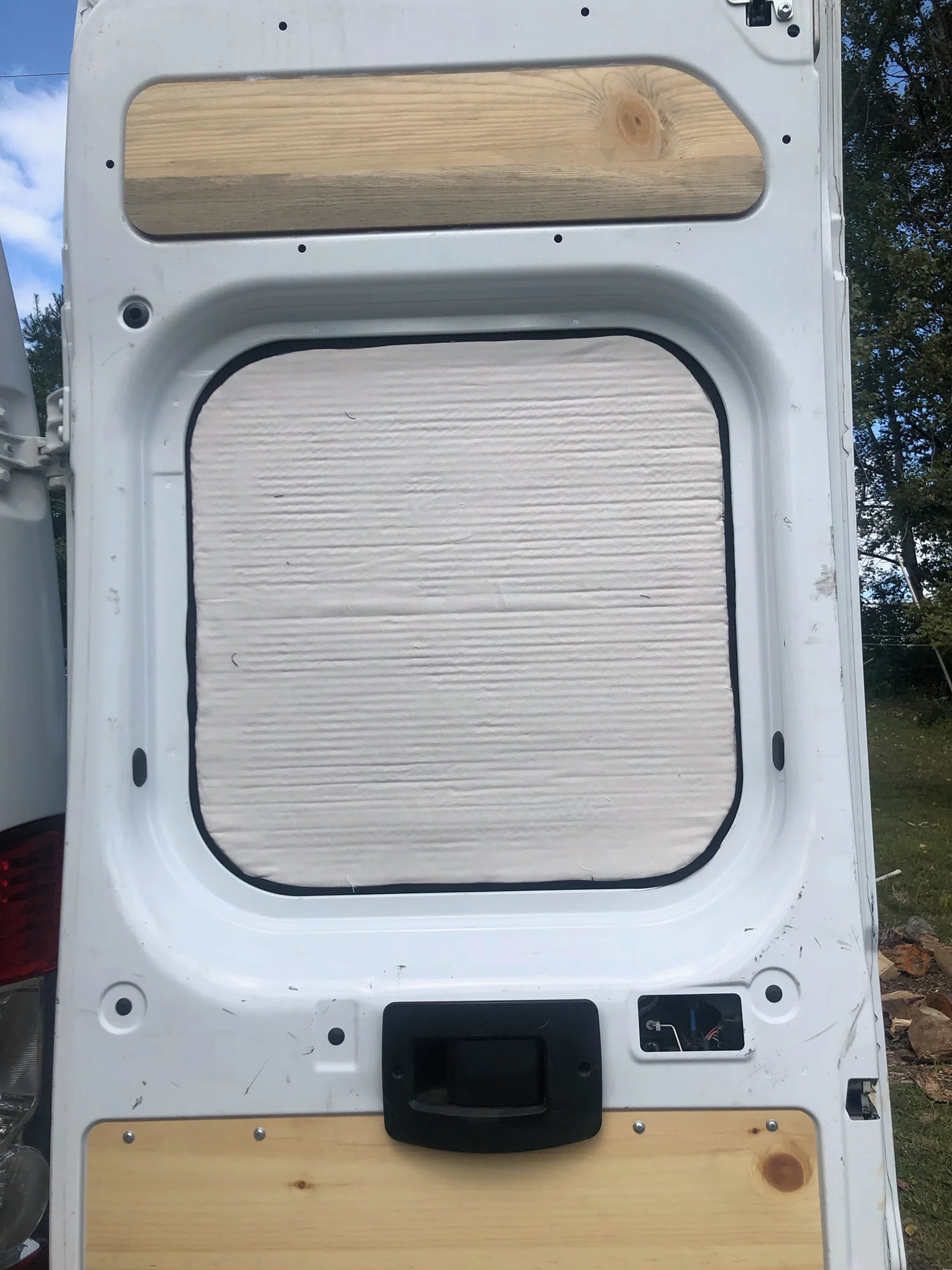 DIY Instructions and material list below are for 2 small back windows and 2 large side windows. We used black fabric on the outside, Reflectix in the middle, and white fabric on the inside to better match our van interior. The inside can be whatever color or design that you want! We also decided to use magnetic tabs to hold the window covers up because our campervan windows are metal.