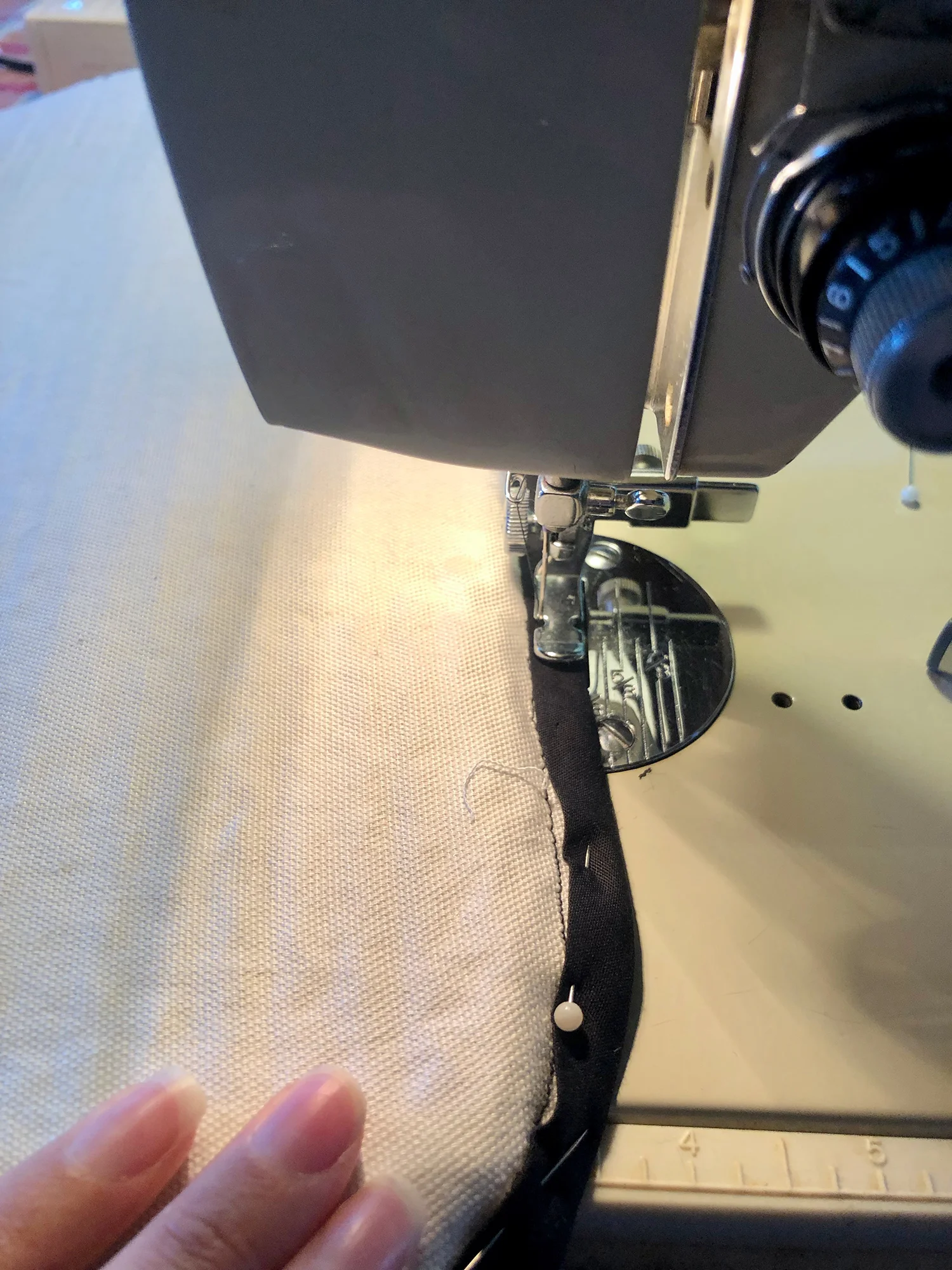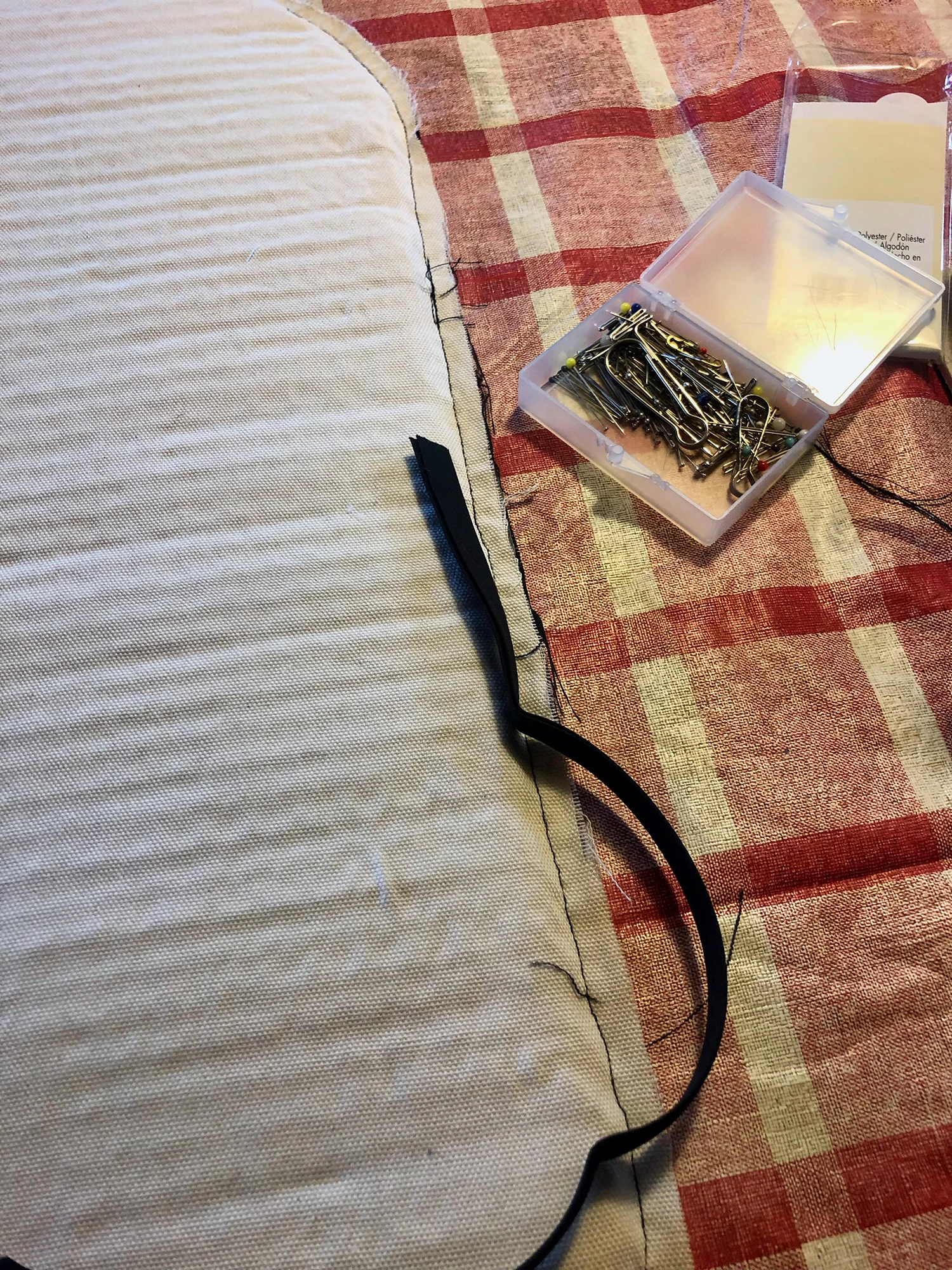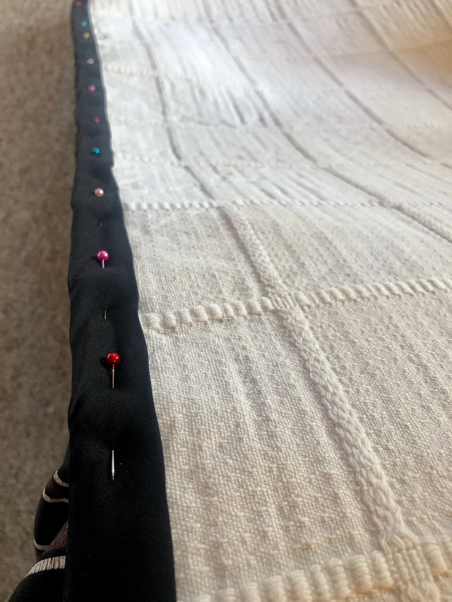 Next we added the bias tape around the edges and pinned all 4 windows before starting to sew. This was one of the most time consuming steps!