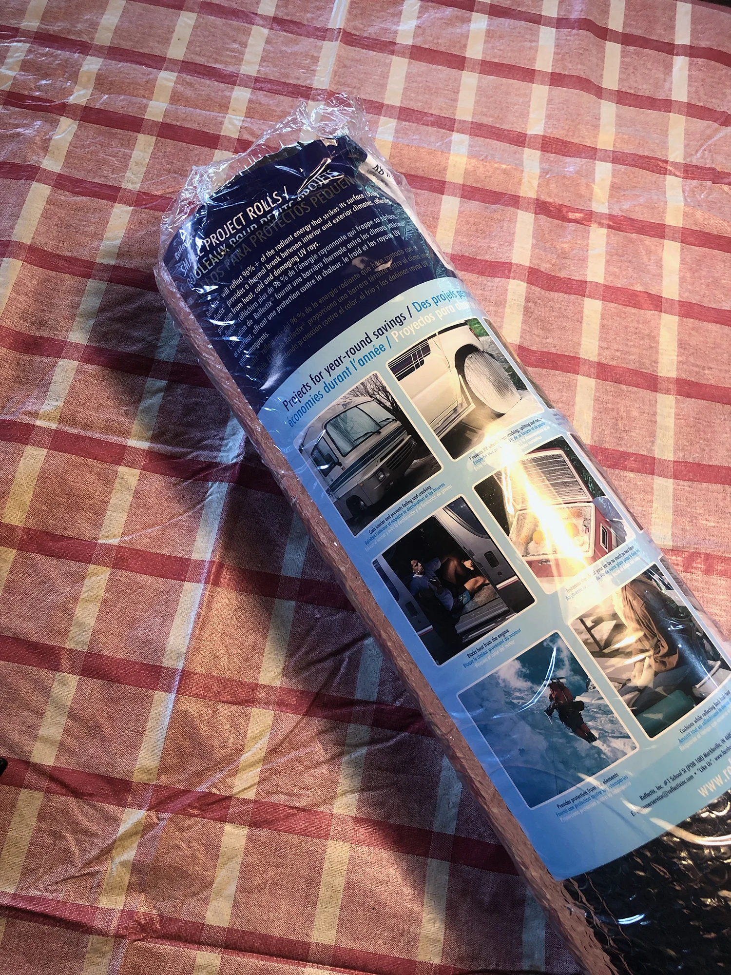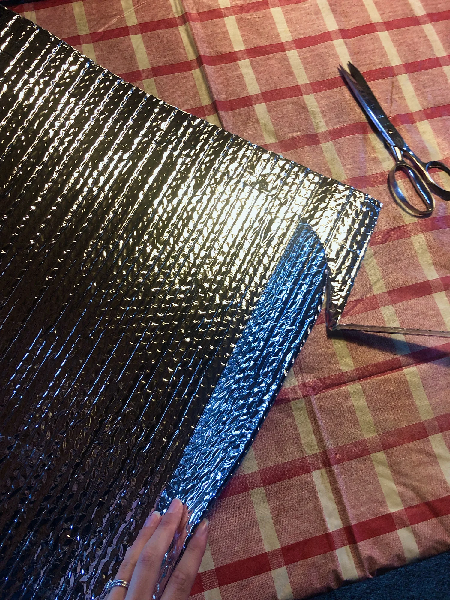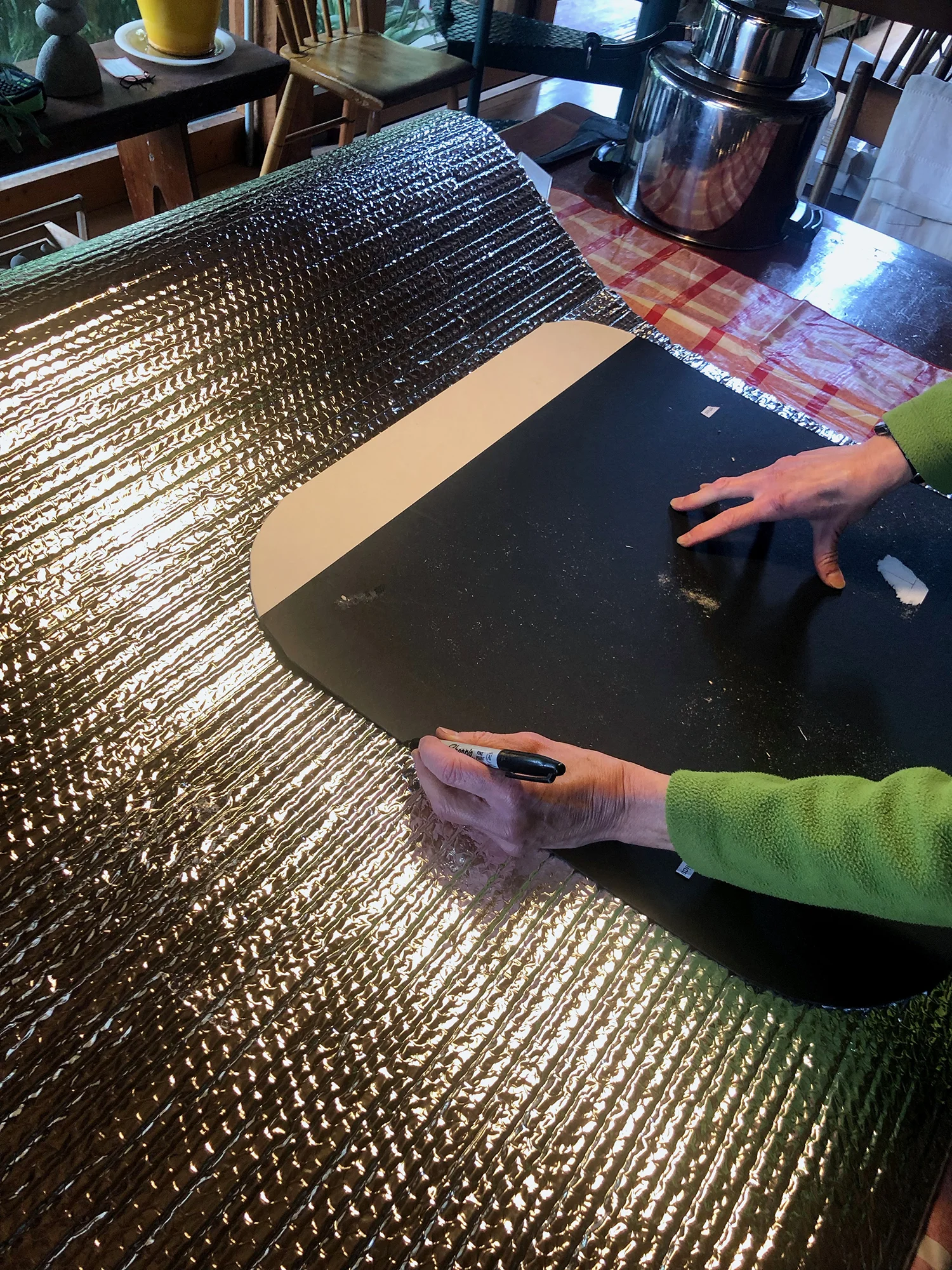 Roll out your Reflectix and draw around your template. Cut out the window shape and triple check that it fits the window. We had a decent amount of Reflectix left over which we might use later in the winter.