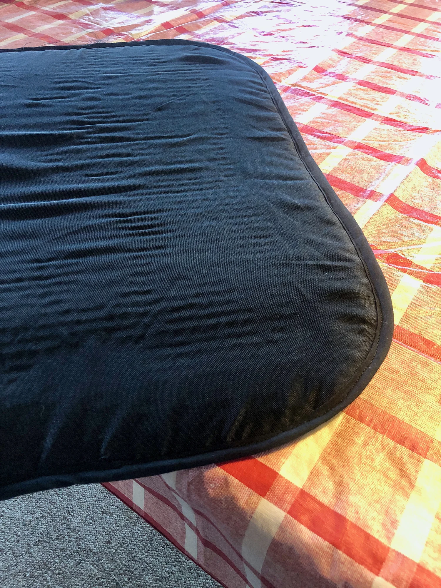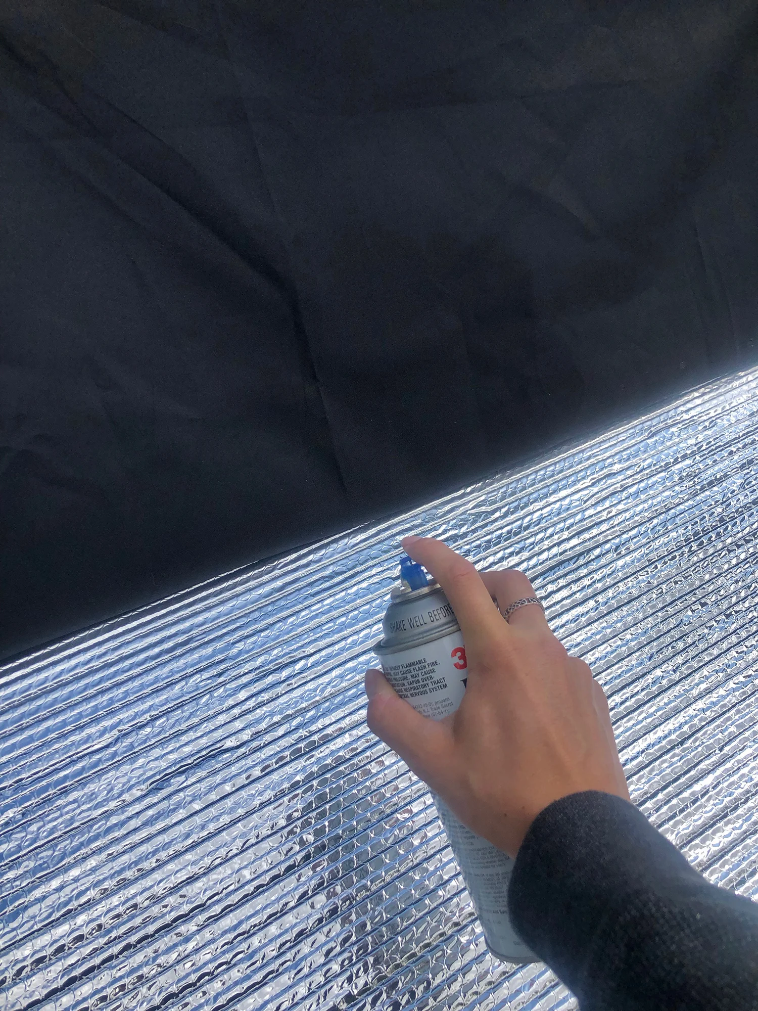 This step is optional but we feel that it helped to hold the fabric in place when we sewed. Slowly spray the top edge of the Reflectix with spray glue, allow a few seconds for it to get tacky and the place the fabric. Continue working your way down in small increments.